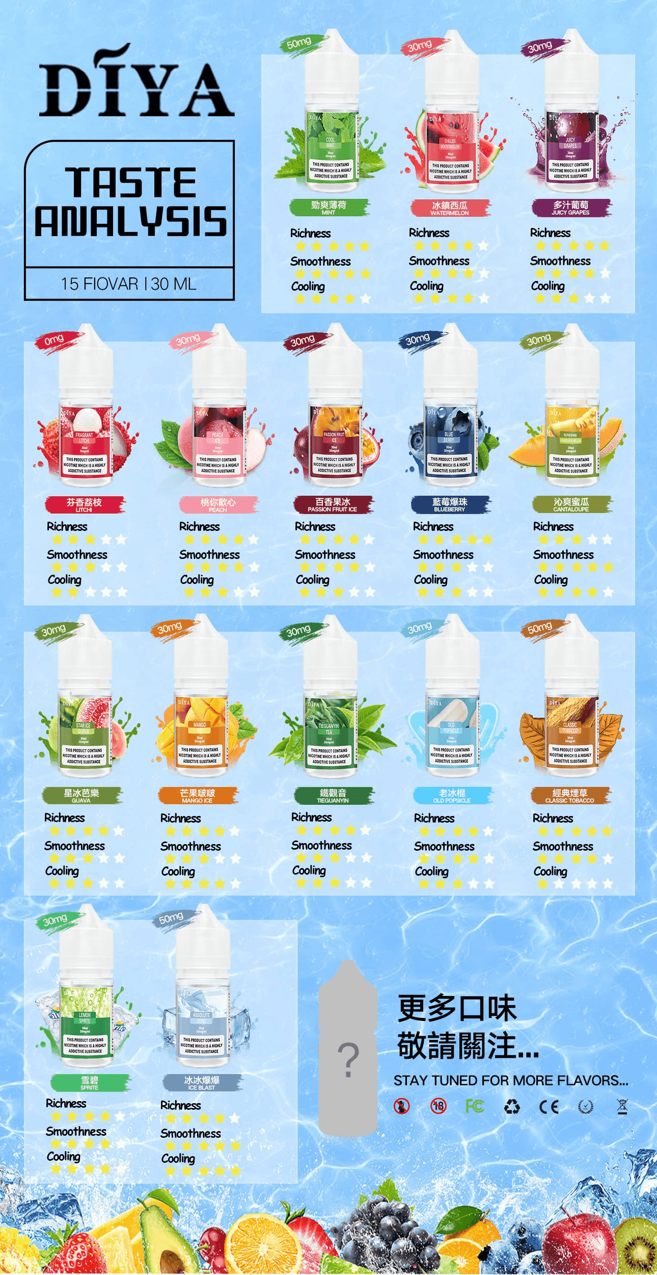 DIYA叮啞全新推出 15 種口味小煙油,0-50MG 尼古丁鹽濃度選擇,滿足不同需求。